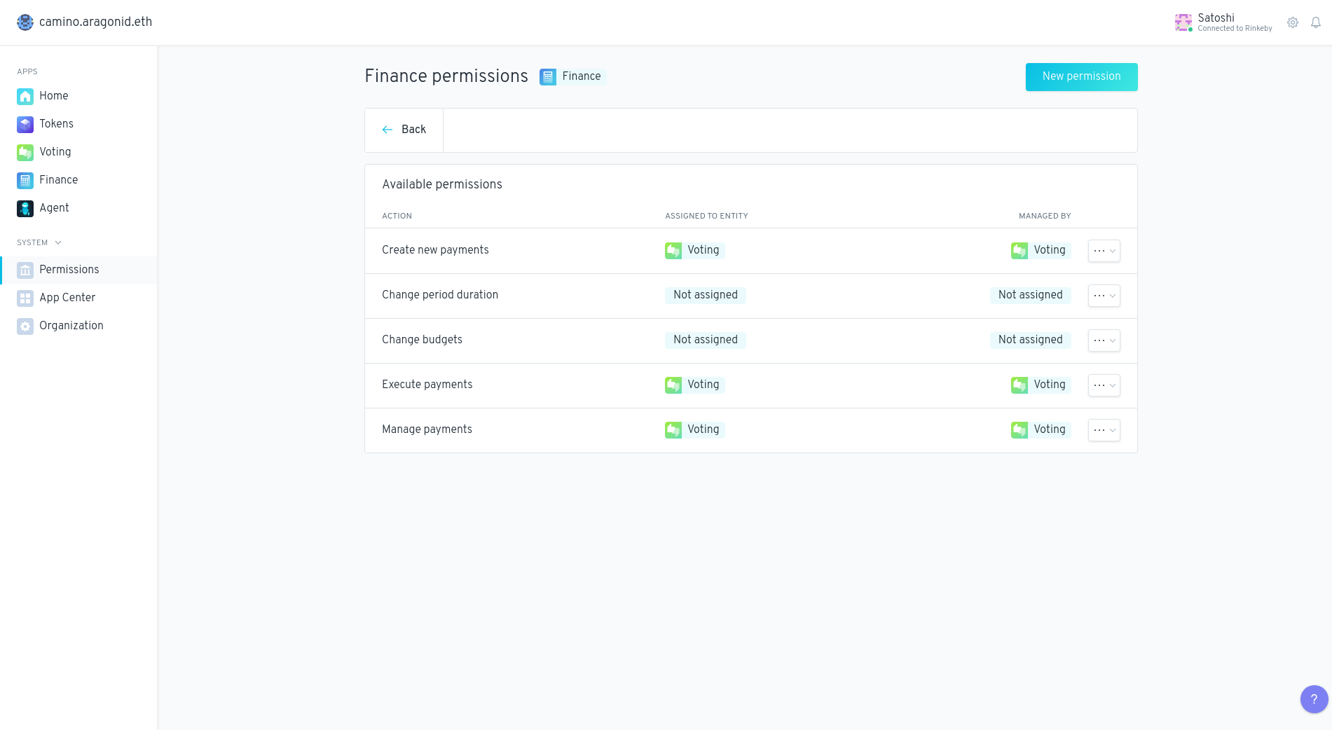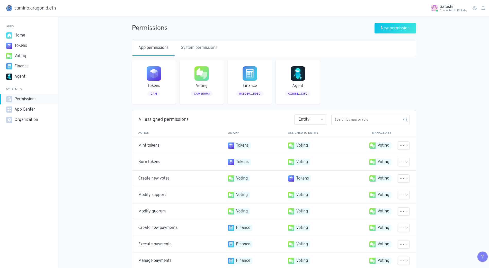 O aplicativo Permissões mostra uma lista de todos os aplicativos instalados na organização e o endereço ou símbolo do token desse aplicativo. Você pode alterar as permissões do aplicativo e as permissões do sistema.
