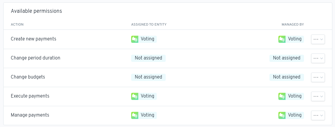 Um gerente tem a capacidade de escolher quais entidades têm permissão para executar uma ação (Atribuir permissão) e a capacidade de alterar o gerente dessa ação (função Gerenciar). Essas ações podem ser feitas usando o menu suspenso sob os três pontos.