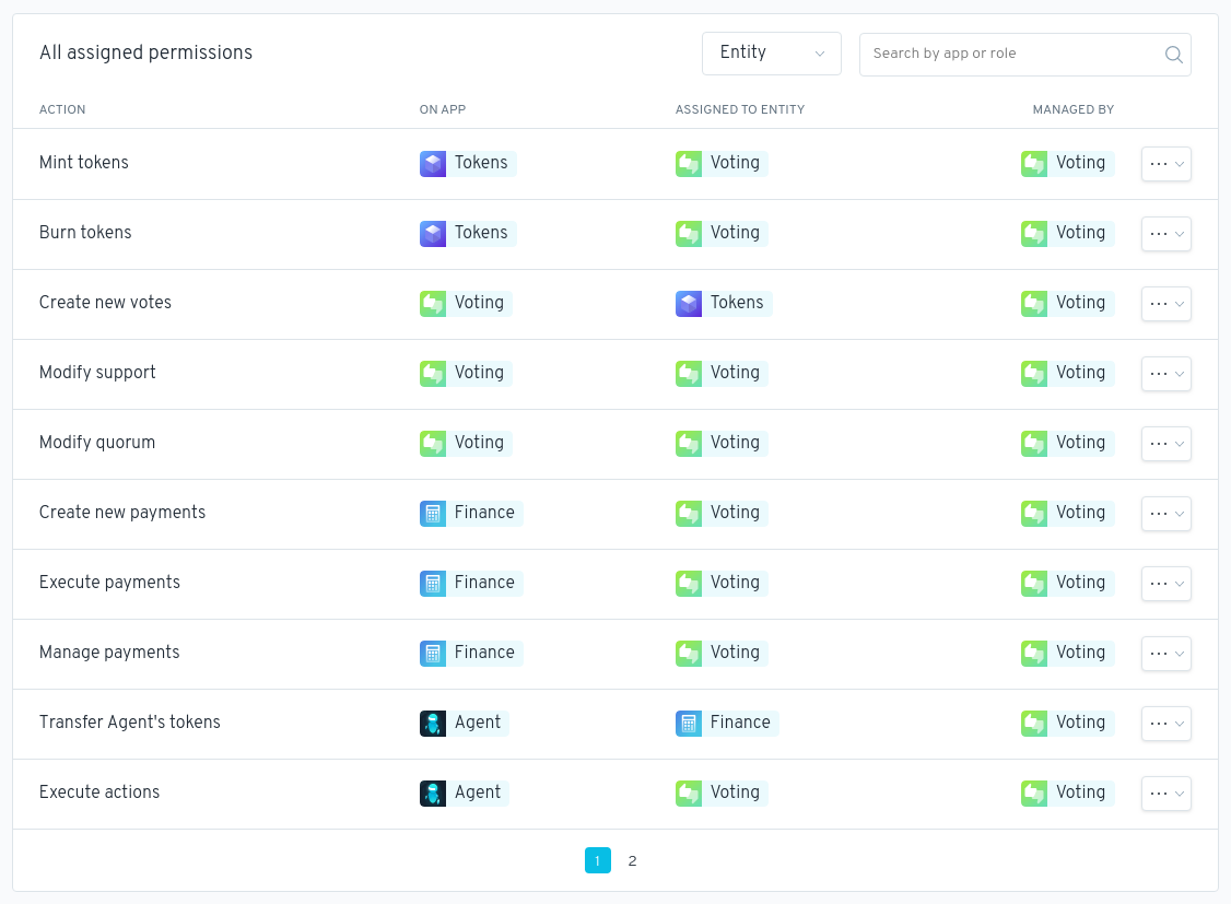 Aqui, você pode ver rapidamente quais entidades receberam permissão para executar quais ações na organização.