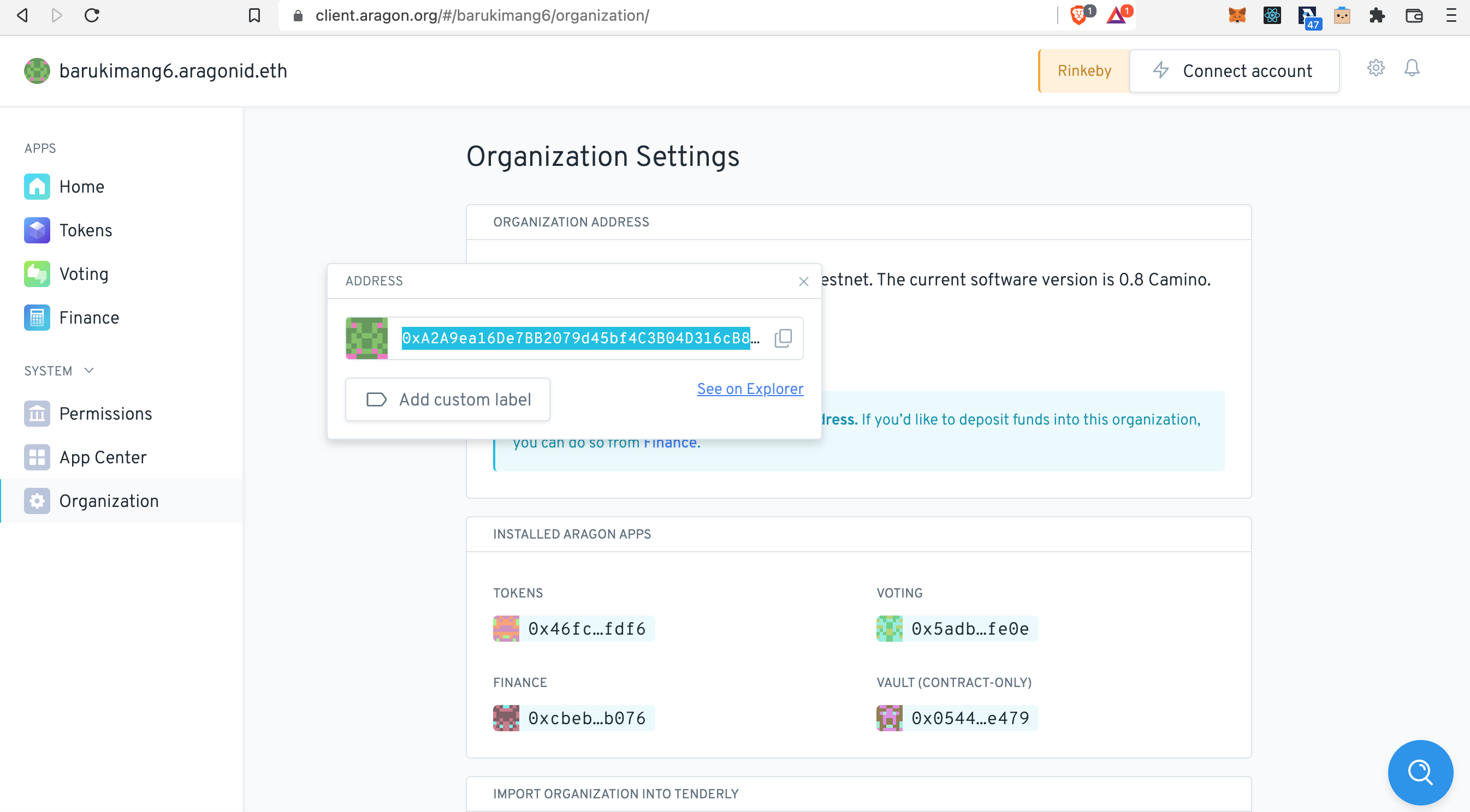 Antes de começar com EVM Crispr, precisamos que você colete o 'endereço' da sua DAO. Você pode encontrÔ-lo em 'SISTEMA > Organização':