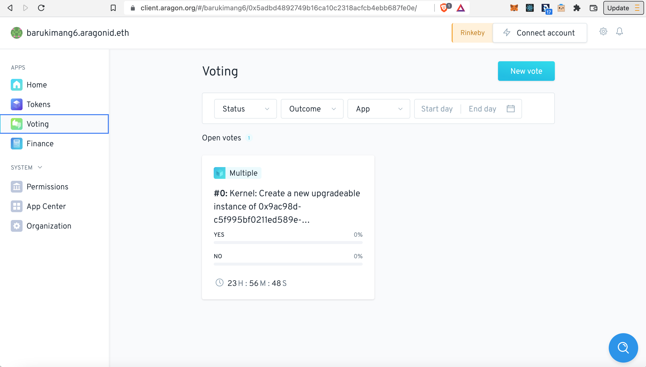 Uma solicitação de transação deve aparecer na sua carteira Web3. Confirme a transação. Assim que a transação for processada com sucesso na sua carteira Web3, retorne a sua DAO no Aragon e abra o aplicativo Votação na barra do menu. Você deve ver que um voto foi gerado: