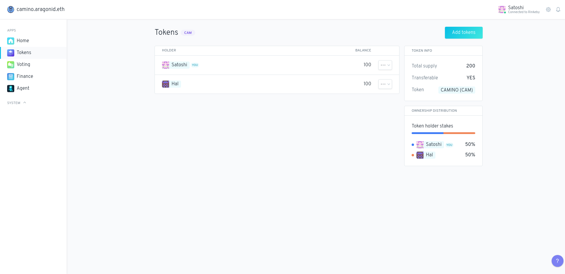 O aplicativo Tokens é usado para gerenciar a associação e o poder de voto em uma organização. Para adicionar membros a uma organização, é tão fácil quanto cunhar e atribuir um token a eles.