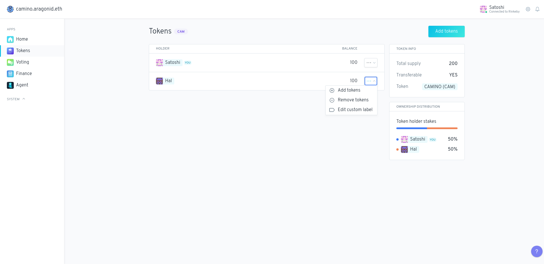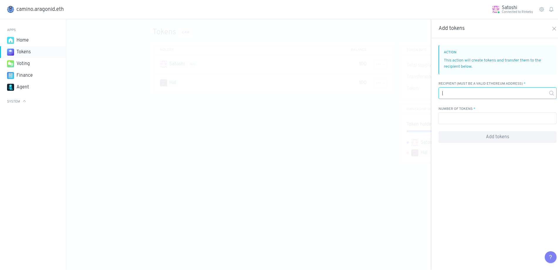 O aplicativo Tokens é usado para cunhar novos tokens e atribuí-los a você ou a outras entidades. Os tokens cunhados pelo aplicativo Tokens conferem habilidades de votação aos detentores dos tokens.