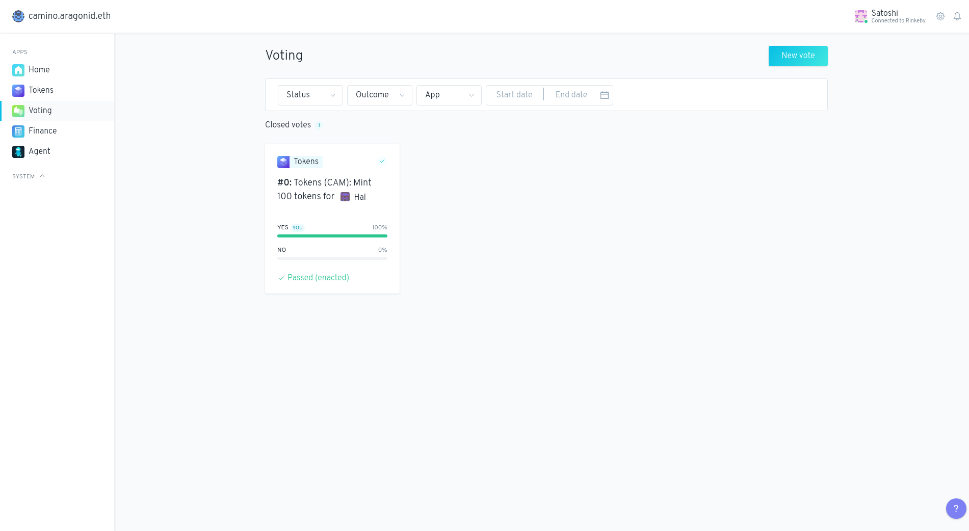 Acesse o aplicativo Votação, clique na proposta de Cunhar tokens que você acabou de criar e vote "Sim" para aprovar a cunhagem e a atribuição do token.