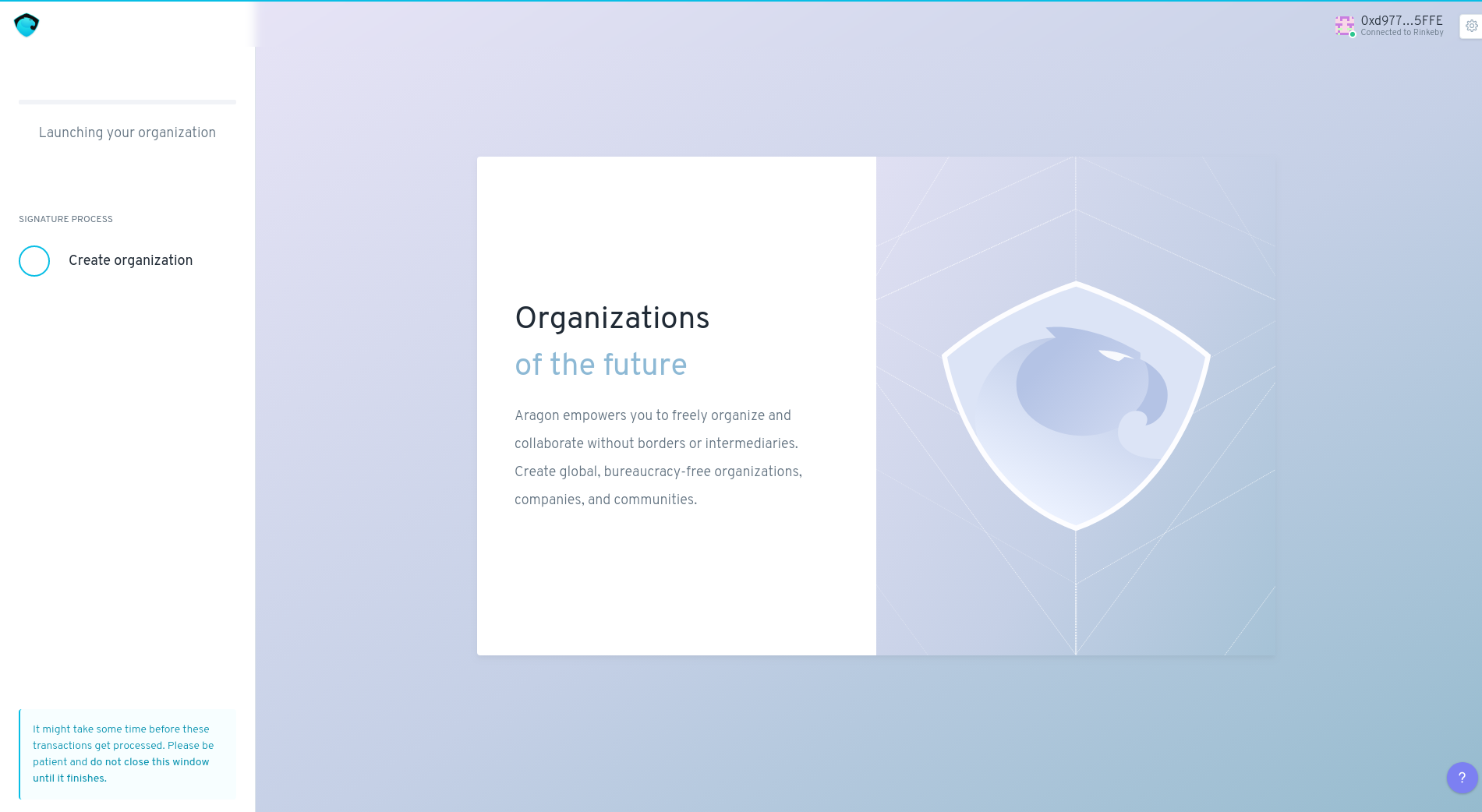Agora você precisa assinar uma transação para criar a sua organização. Abra seu provedor Ethereum se a janela não abrir automaticamente. Clique no botão confirmar no seu provedor Ethereum para assinar e transmitir a transação.