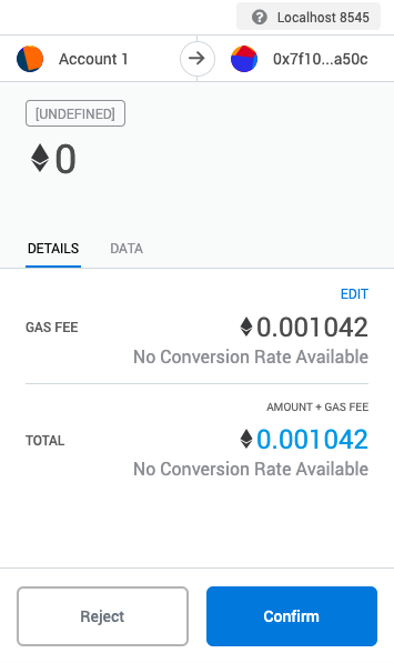 In case you're unfamiliar with the concept of **Gas**, the **Gas fee** is what's used to incentivize miners to add your transaction to the blockchain. You can think of it as a small tip. Remember that this transaction is taking place on a local (private) network, so this isn't real money. If you're happy with the details of the transaction, click on *Confirm*.