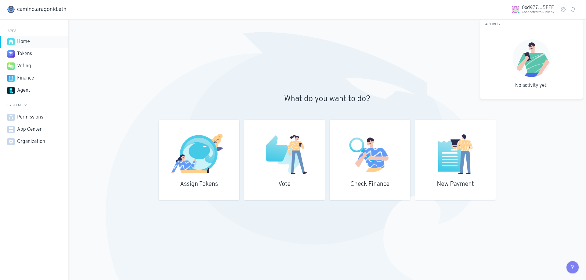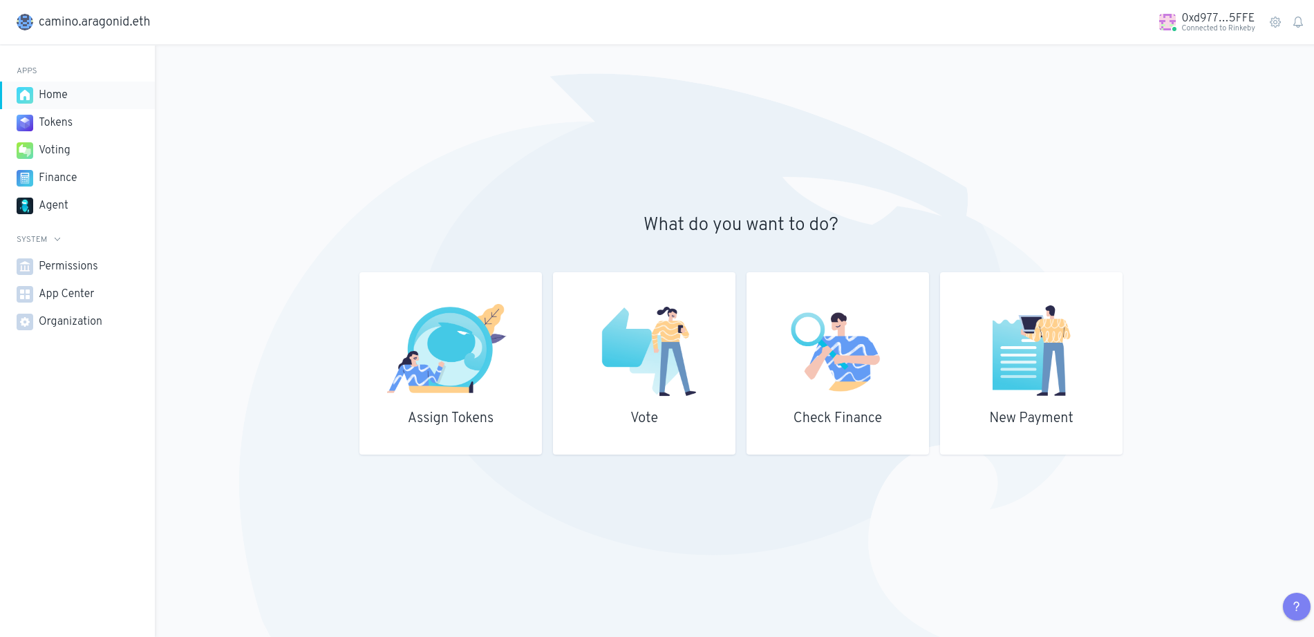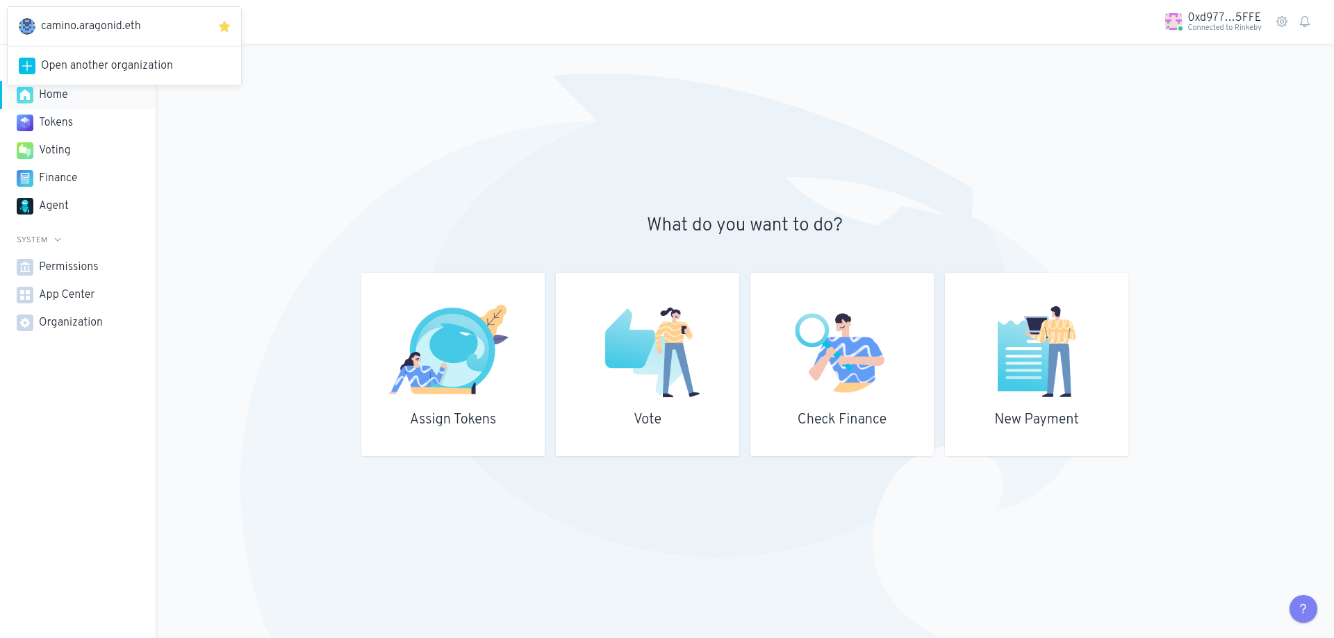 En el ejemplo (mostrado en la imagen), la organización camino.aragonid.eth tiene instaladas las aplicaciones Token Manager, Voting, Finance y Agent, además de las aplicaciones por defecto Permissions, App Center y Organization System.
