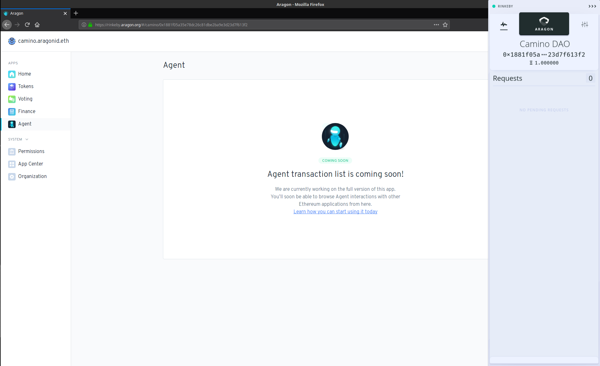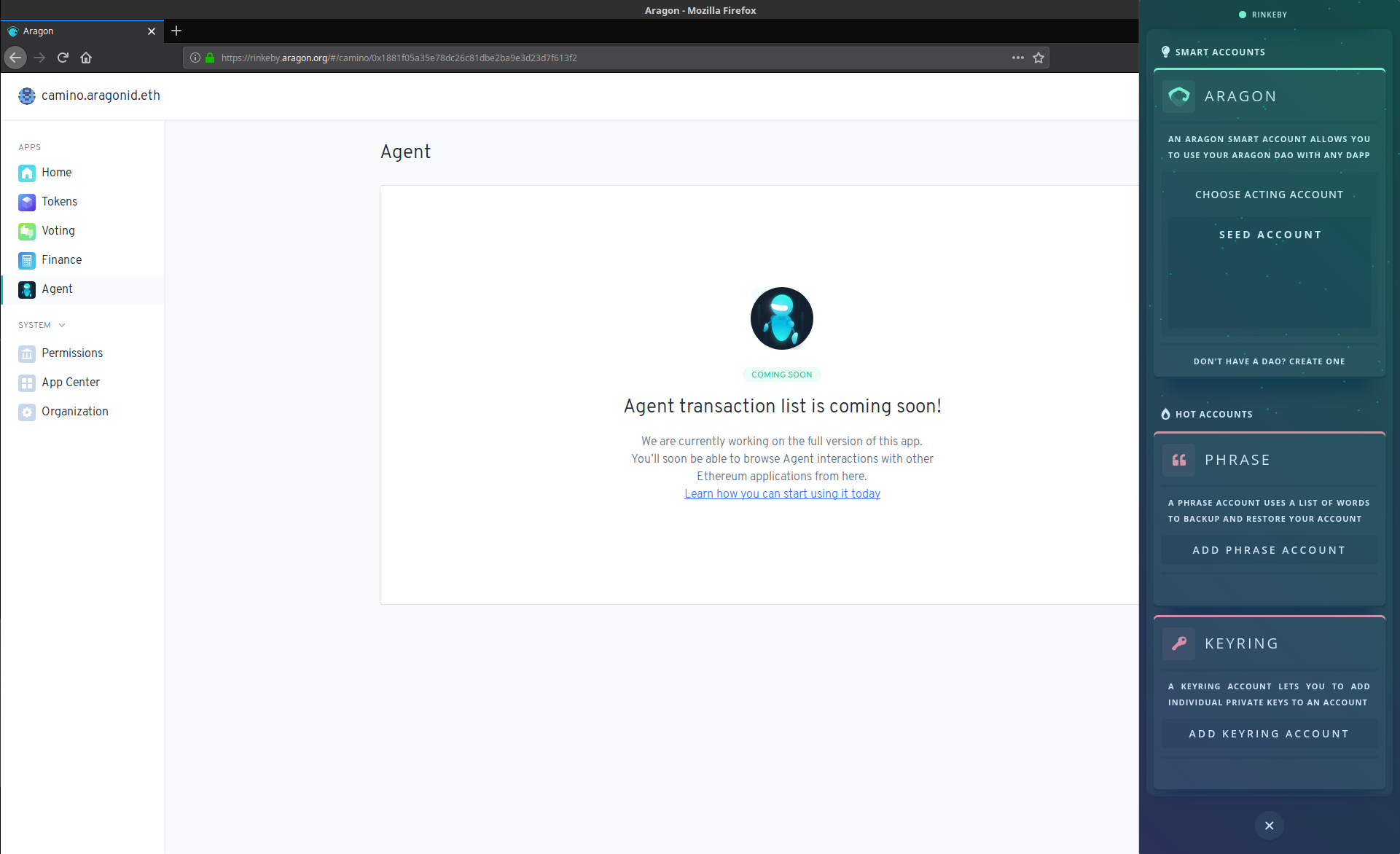 Haga clic en el logotipo de Aragon para utilizar su cuenta de Agent. Introduzca su contraseña si está utilizando una hot account (cuenta caliente). Ahora está listo para interactuar con cualquier otro contrato inteligente de Ethereum directamente con su Aragon Agent.