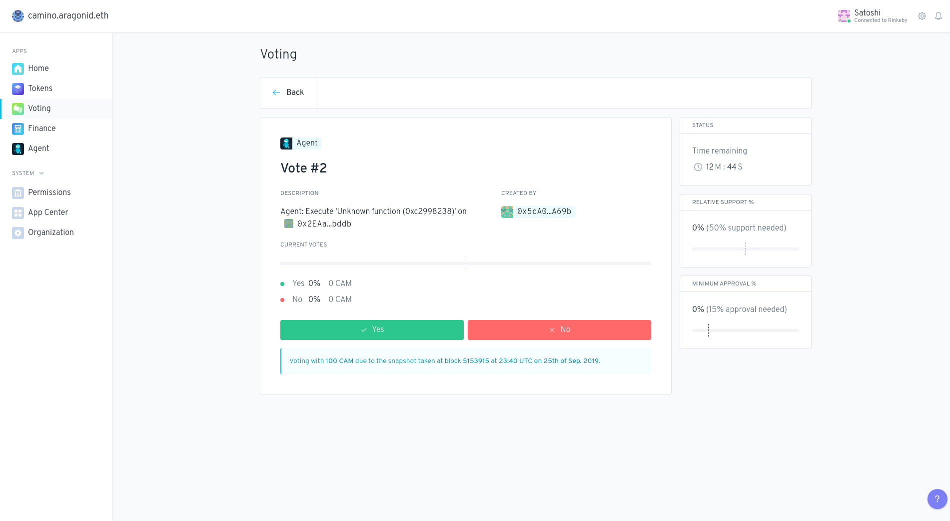 Recuerde que, en función de los permisos establecidos en su organización, es posible que los titulares de tokens de su organización tengan que visitar la aplicación Voting y votar en cada transacción realizada mediante la Agent App.