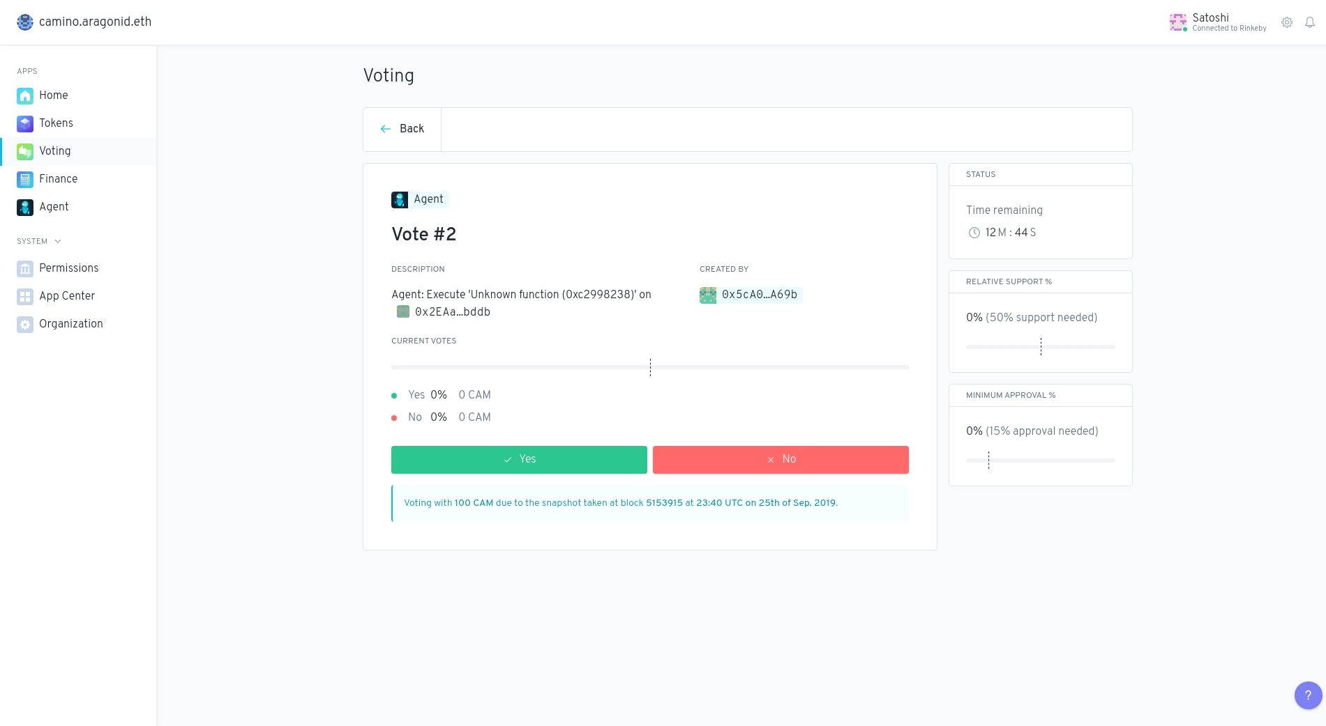 याद रखें कि आपके संगठन में निर्धारित अनुमतियों के आधार पर, आपके संगठन के टोकन धारकों को वोटिंग ऐप पर जाने और एजेंट ऐप का उपयोग करके किए गए प्रत्येक लेनदेन पर वोट करने की आवश्यकता हो सकती है।