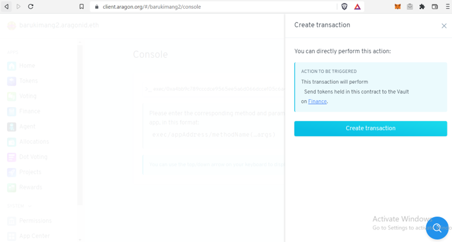 それでは、Aragon コンソールからこの関数を呼び出してみましょう。コンソールのコマンドに`recoverToVault(address _token)`を追加する必要がありますが、まず`address _token`をFinance Appに誤って送信されたトークンのコントラクト アドレスに置き換えてください。