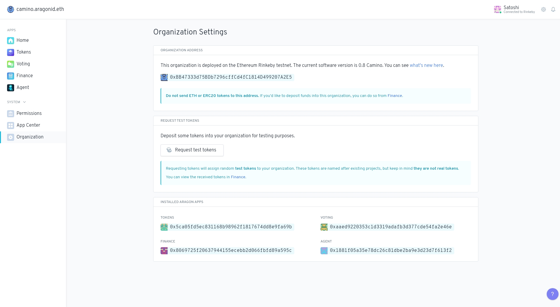 Organizationページには、インストールされているアプリのアドレスなど、DAOに関する情報が表示されます。これらのアプリはそれぞれ独立したスマートコントラクトであり、このアドレスを使用して直接やり取りすることができます。