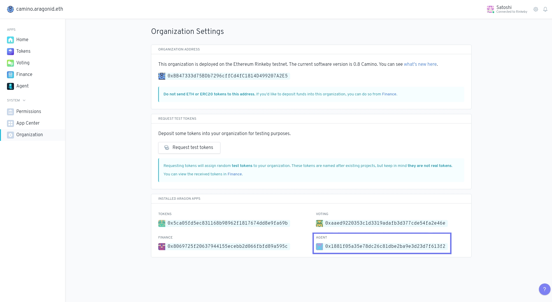 Agentスマートコントラクトのアドレスは、OrganizationページのSystemメニューから確認できます。