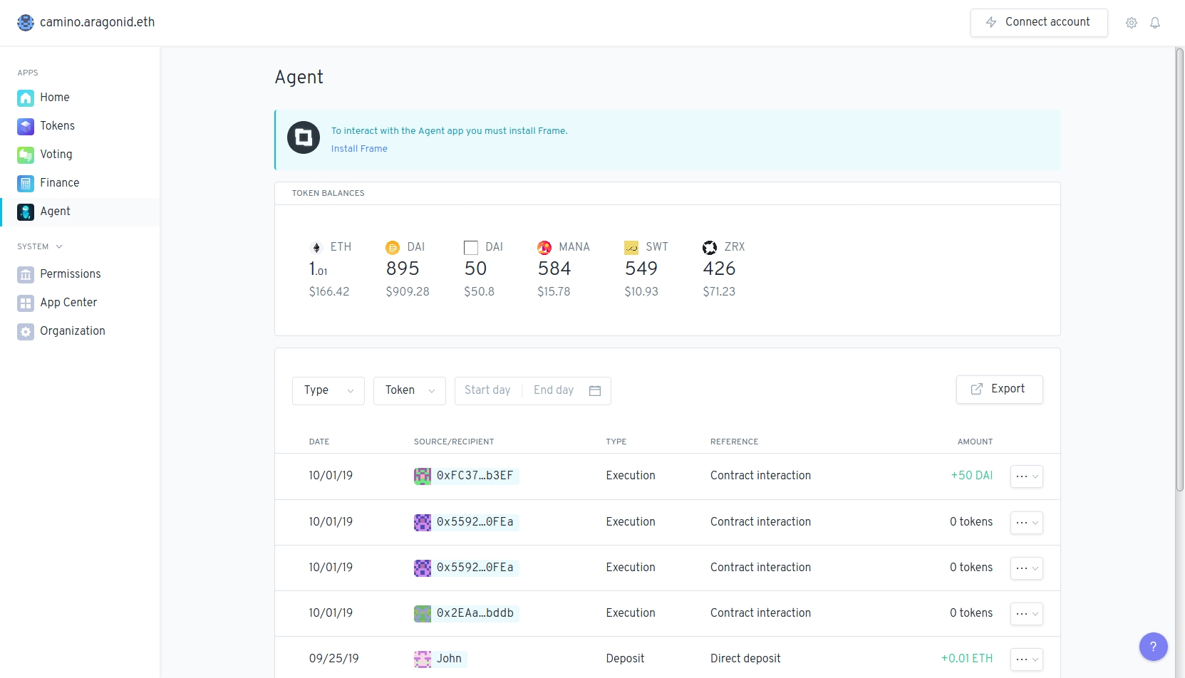 Agent Appは、DAOがEthereum上の他のスマートコントラクトと直接やり取りすることを可能にします。Agentがなかった時は、DAOは、イーサリアムのスマートコントラクトとやり取りするために、信頼できるパーティを指名する必要がありました。