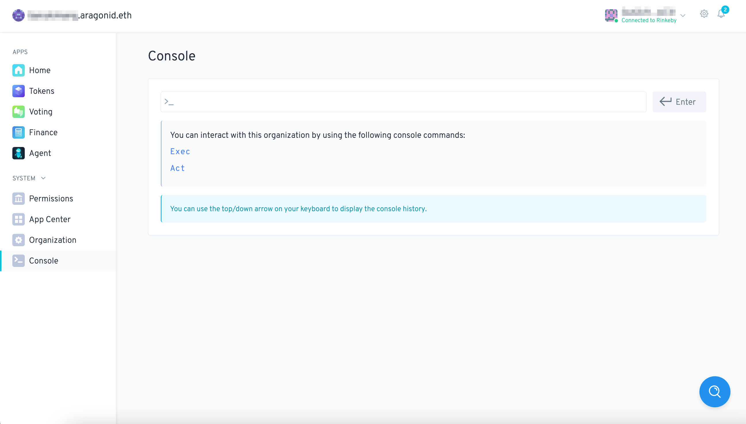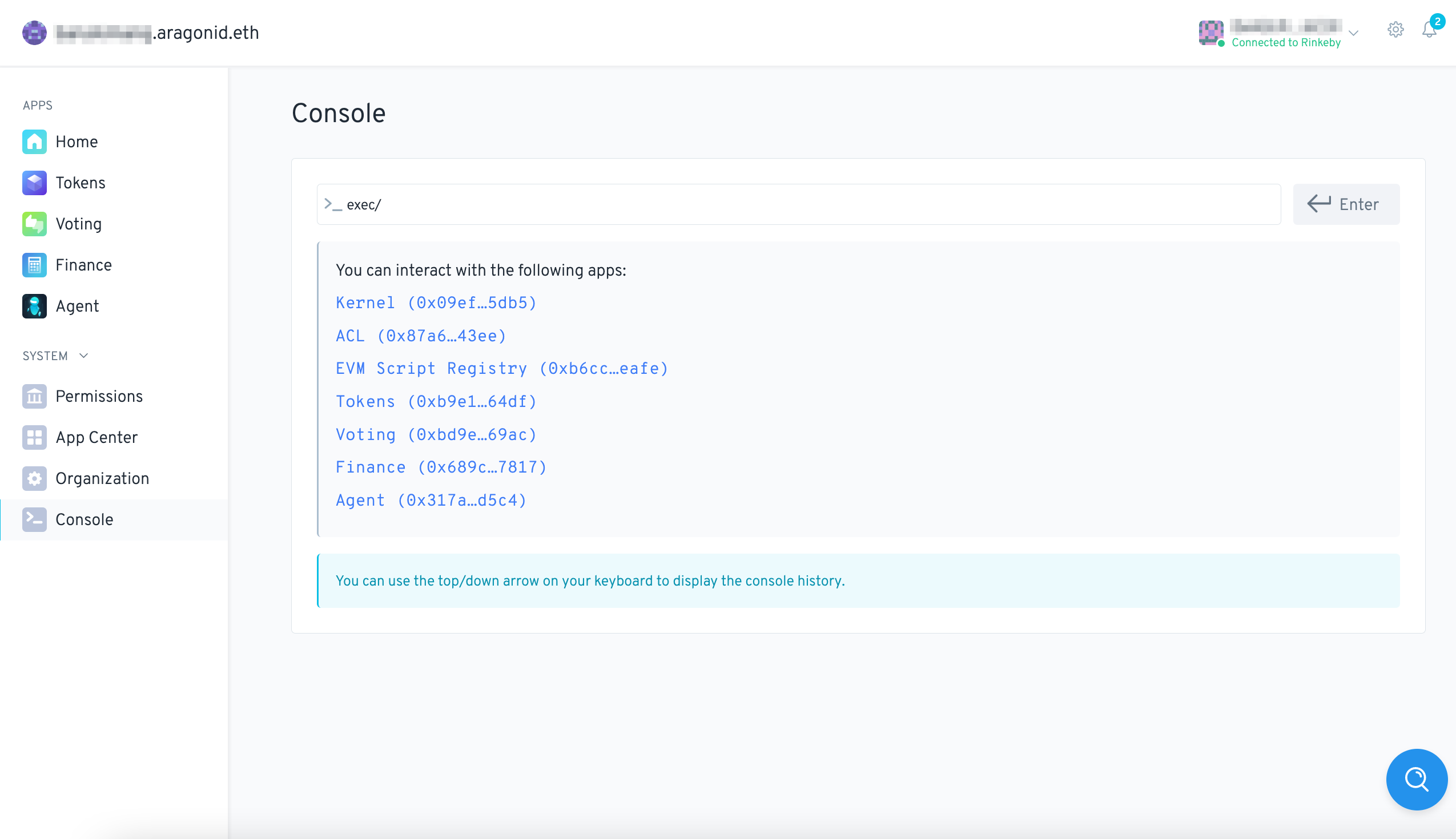 Open your DAO, adding `/console` to the end of your DAO web address. The URL would look like this: `https://client.aragon.org/#/<your-dao-name>/console`
