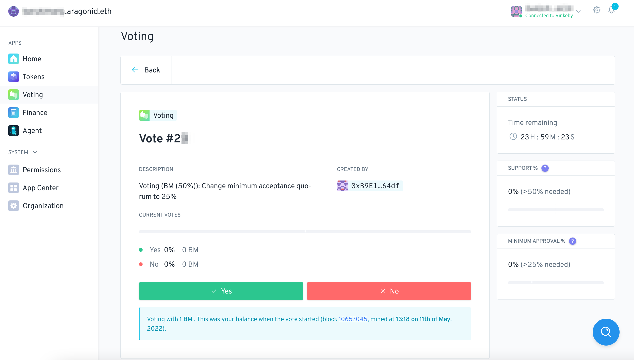 You are almost there! But first go to the Voting app since this change has automatically generated a vote. Now you (and enough of your DAO members) need to approve the vote for it to pass: