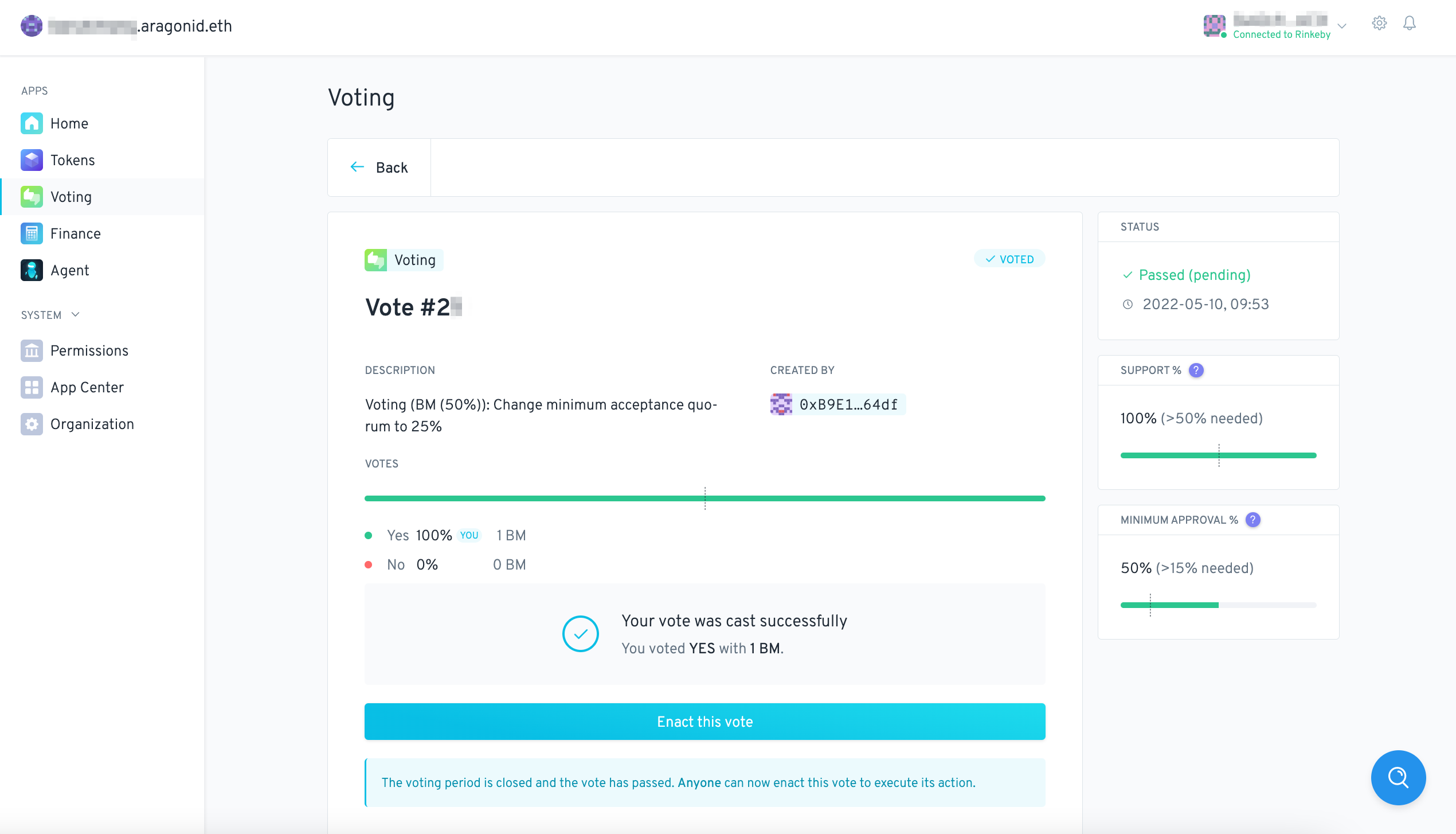 When the voting time has run out click on 'Enact this vote' and sign the transaction with your Web3 Provider: