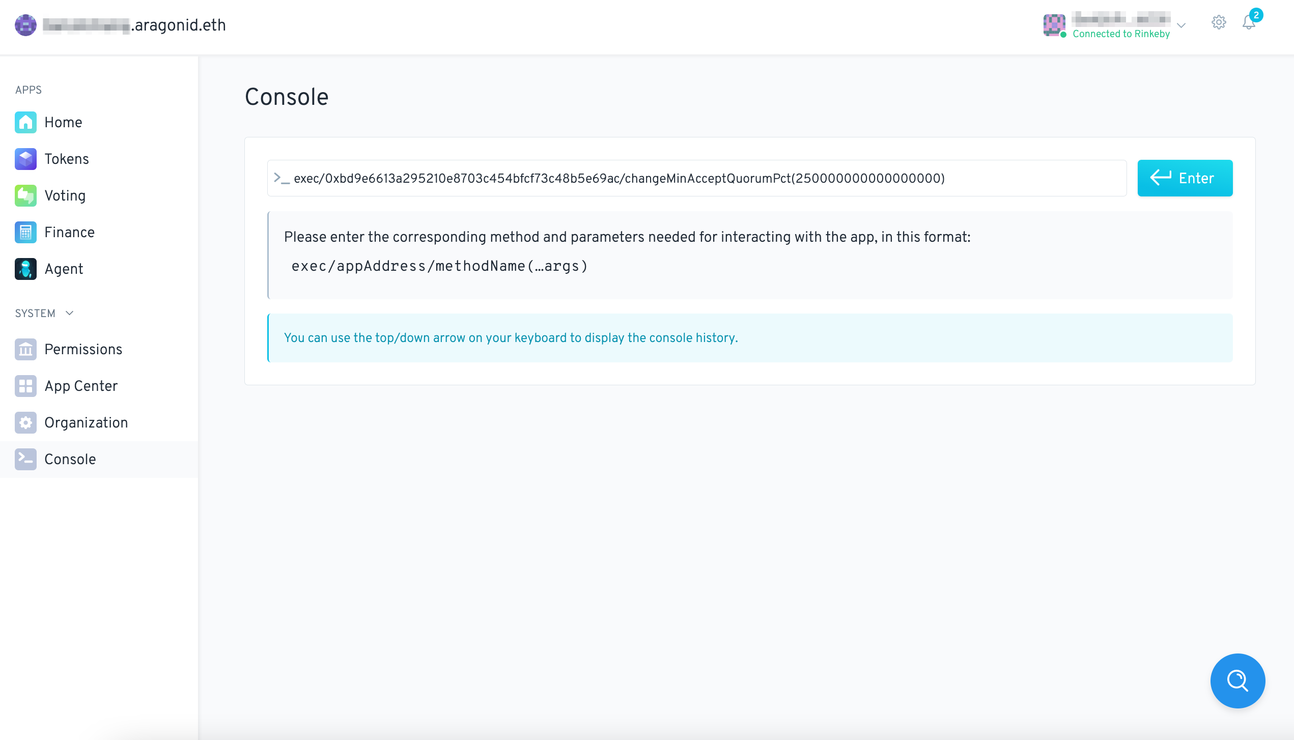 We will now call this function from the Aragon Console. We will have to add `changeMinAcceptQuorumPct(uint64 _minAcceptQuorumPct)` to the command in the console, but first we will replace `uint64 _minAcceptQuorumPct` with your desired minimum Quorum Percentage.