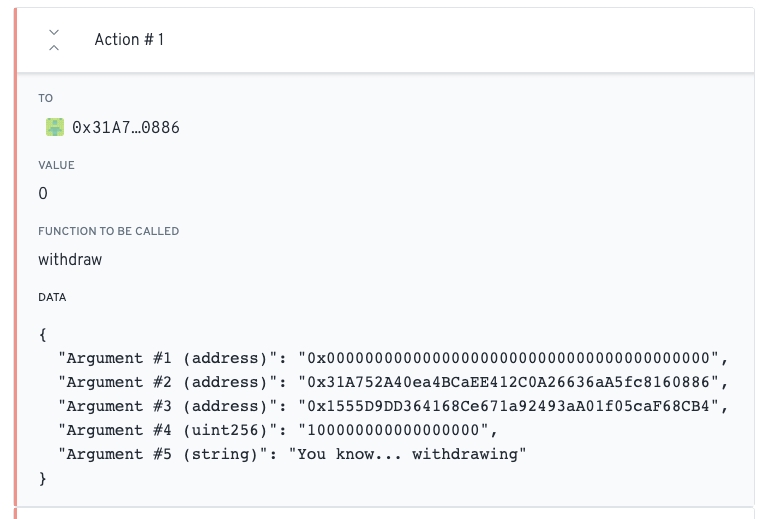 Original justification: This is a human-readable justification stating why actions were scheduled to be executed. For example, the creator might say something like "Transferring funds to a project that is creating a carbon footprint offset device". This is added by the actions creator when scheduling the actions.