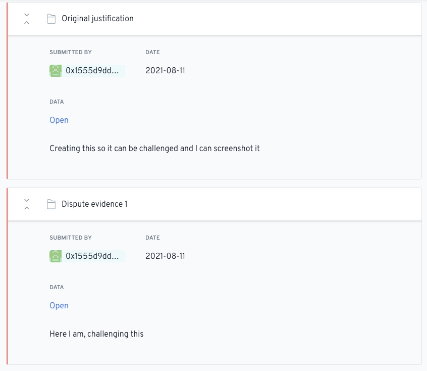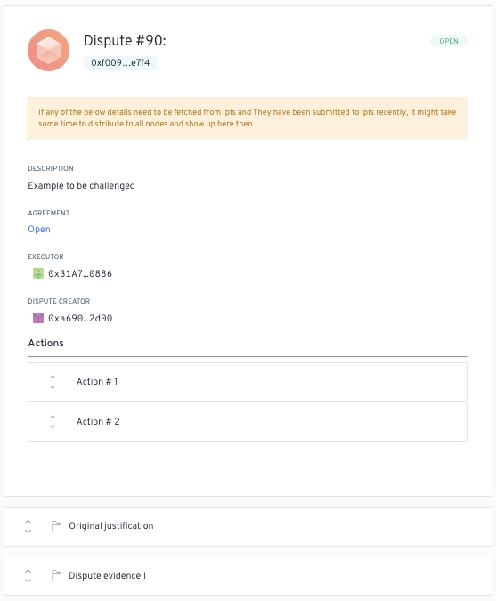 Dispute evidence: The justification of why the actions are being challenged. For example, something like "The destination address belongs to a car manufacturing company, and therefore we should not allow this transferring of the funds". This is added by the person that challenged the actions.