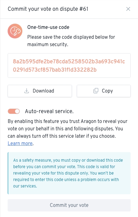 To make sure guardians act without any bias, votes are kept secret during the voting phase. For this reason, when you commit your vote, you will be asked to save a one-time code to be used when the reveal phase starts.