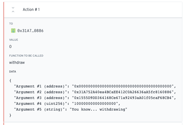 This is a human-readable justification stating why actions were scheduled to be executed. For example the creator might say something like "Transferring funds to a project that is creating a carbon footprint offset device". This is added by the actions creator during scheduling.
