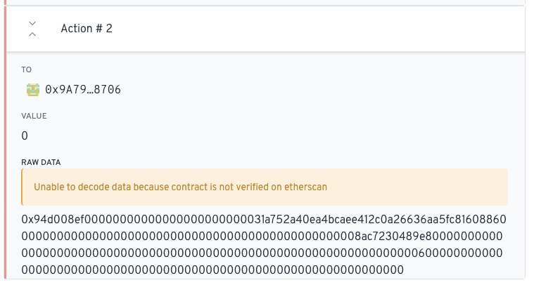 Sometimes the function and data might not be available (when the contract is not verified on Etherscan (Learn More). In this case, you will see the Raw Data, which can still be decompiled if you research the destination contract.