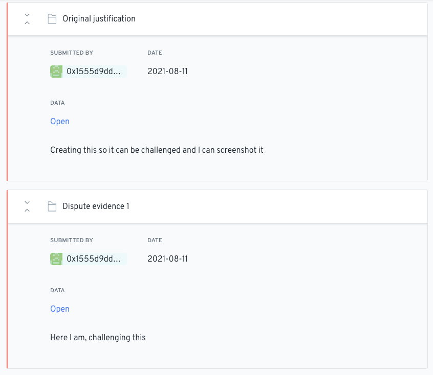 The justification of why the actions are being challenged. For example "The destination address actually belongs to a car manufacturing company, and therefore we should not allow this transferring of the funds". This information is added by the person challenging the actions.