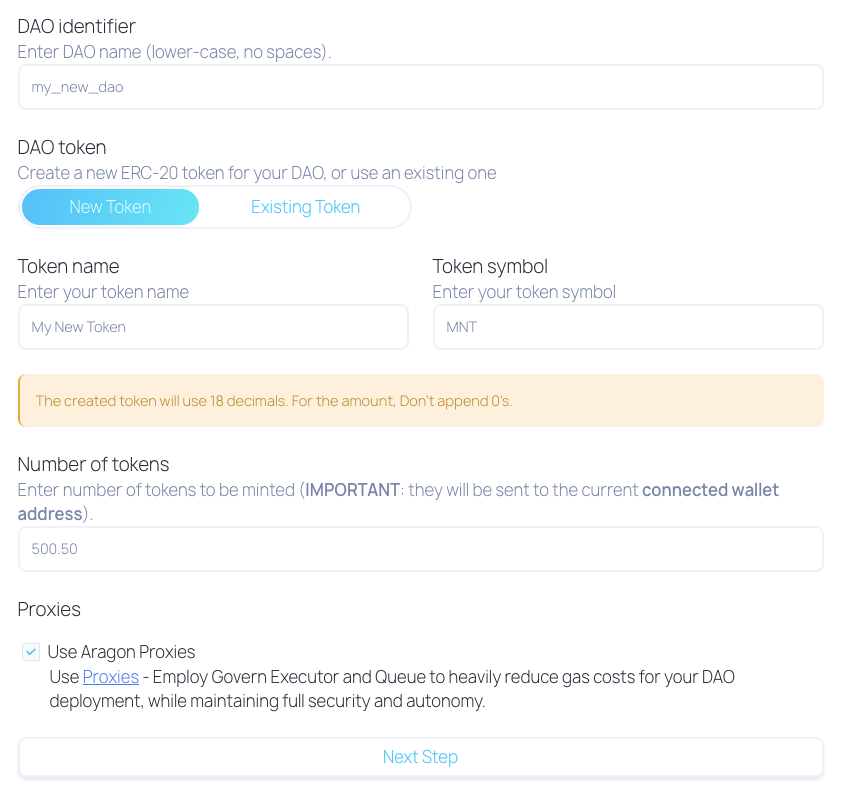 DAO token: Fill out the information about the token your community will use to govern your DAO. 3-4 letters is generally sufficient for your token name.