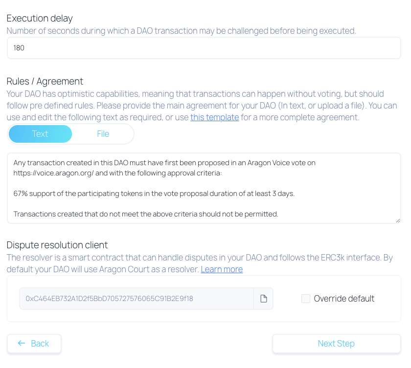 Dispute resolution client: This is the address of a smart contract that can act as a dispute resolution system for the optimistic governance model to be enacted. The default address is set to Aragon Court, a tested and secure dispute resolution system by Aragon. Be aware that if you change this address, and the new smart contract does not implement the ERC3k standard (or it relies on an insecure system) you might make your DAO unusable or allow funds to be stolen.