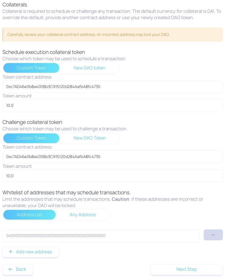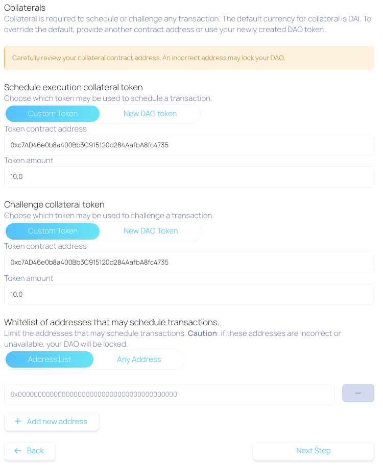 Whitelist of addresses (optional): This is an additional safeguard step you might want to add to your DAO to grant only a subset of members permission to schedule transactions.
