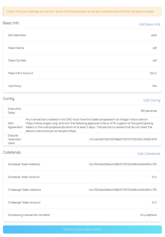 If you are happy with it, just go ahead and click the "Confirm and create a DAO" button.