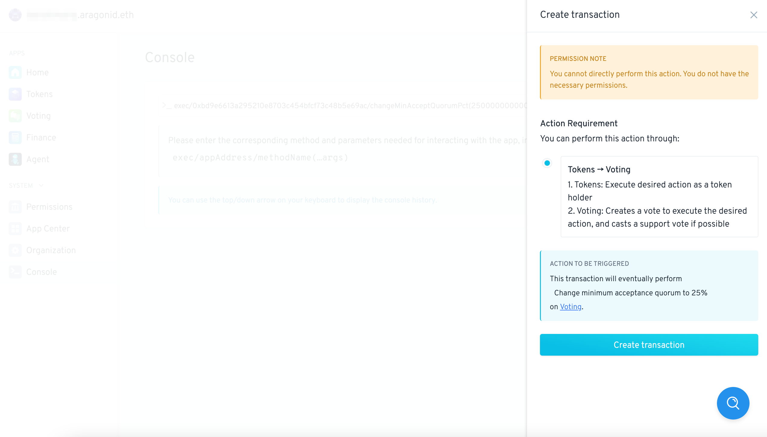 Here the app warns that the permission can not be directly changed, but that a vote will be created to change the permission. Click on 'Create transaction':